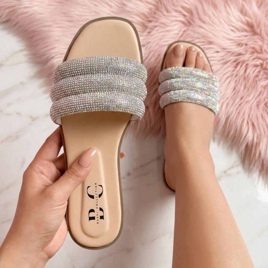 - La sandalia para dama presenta una tira con brillos que añade un toque de estilo.